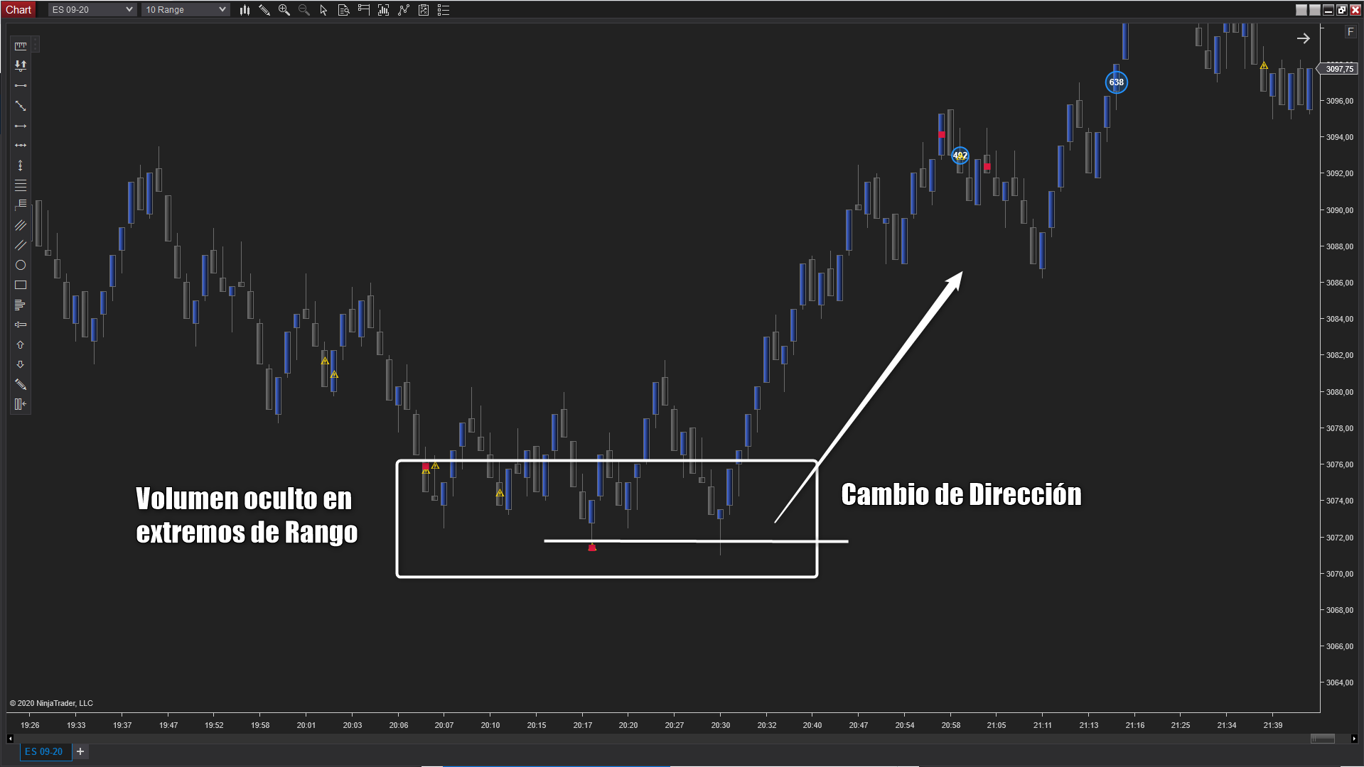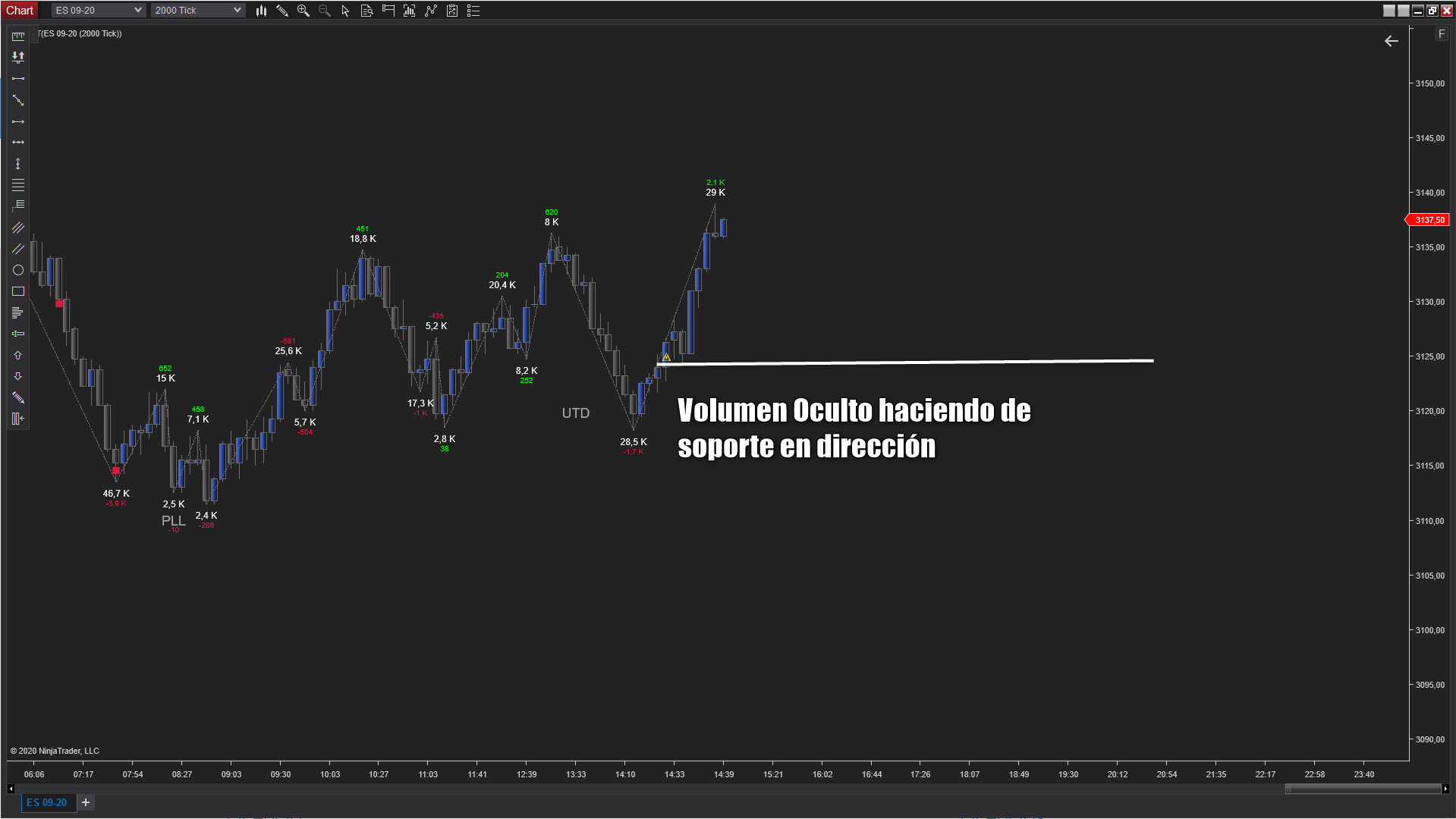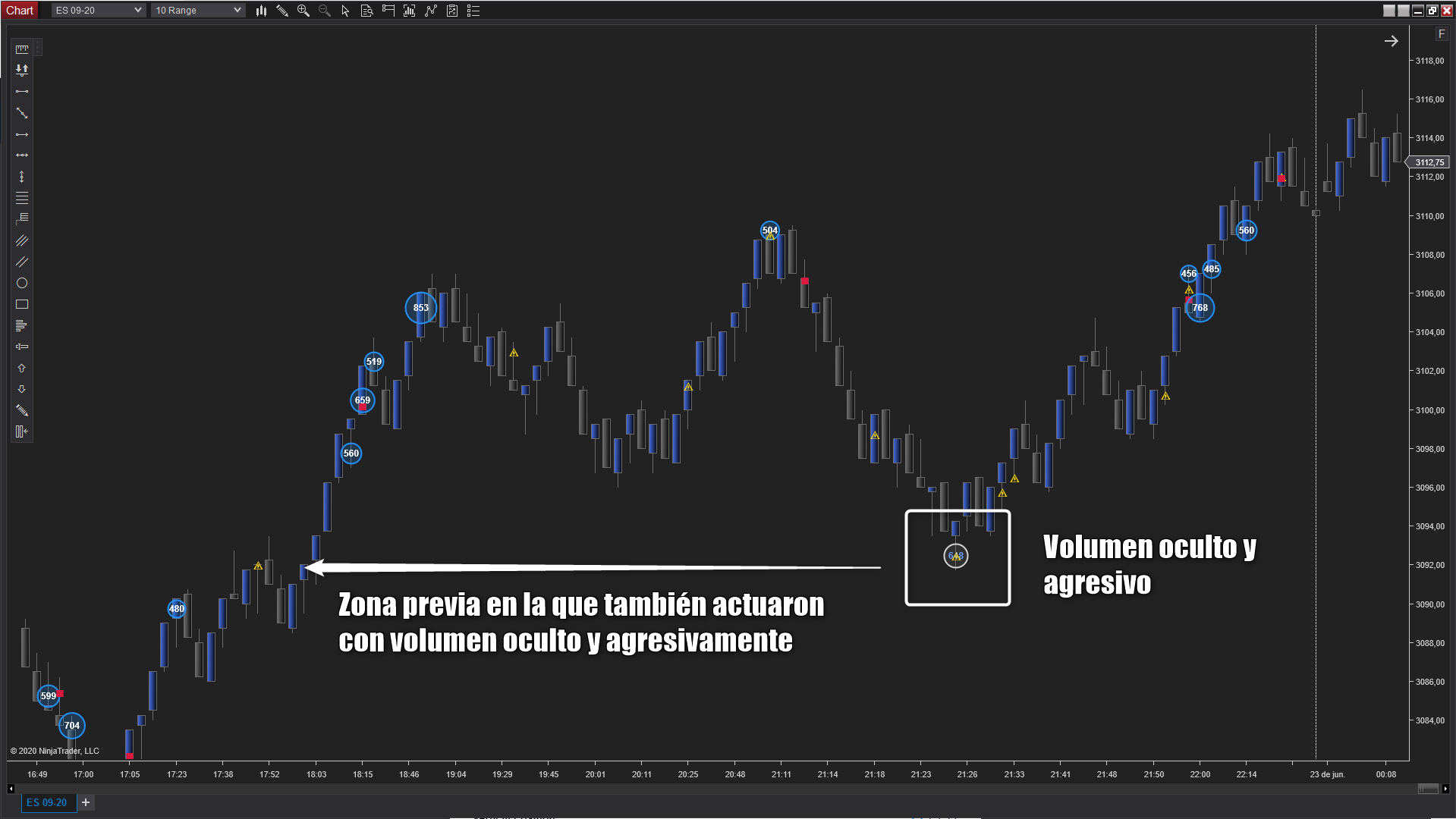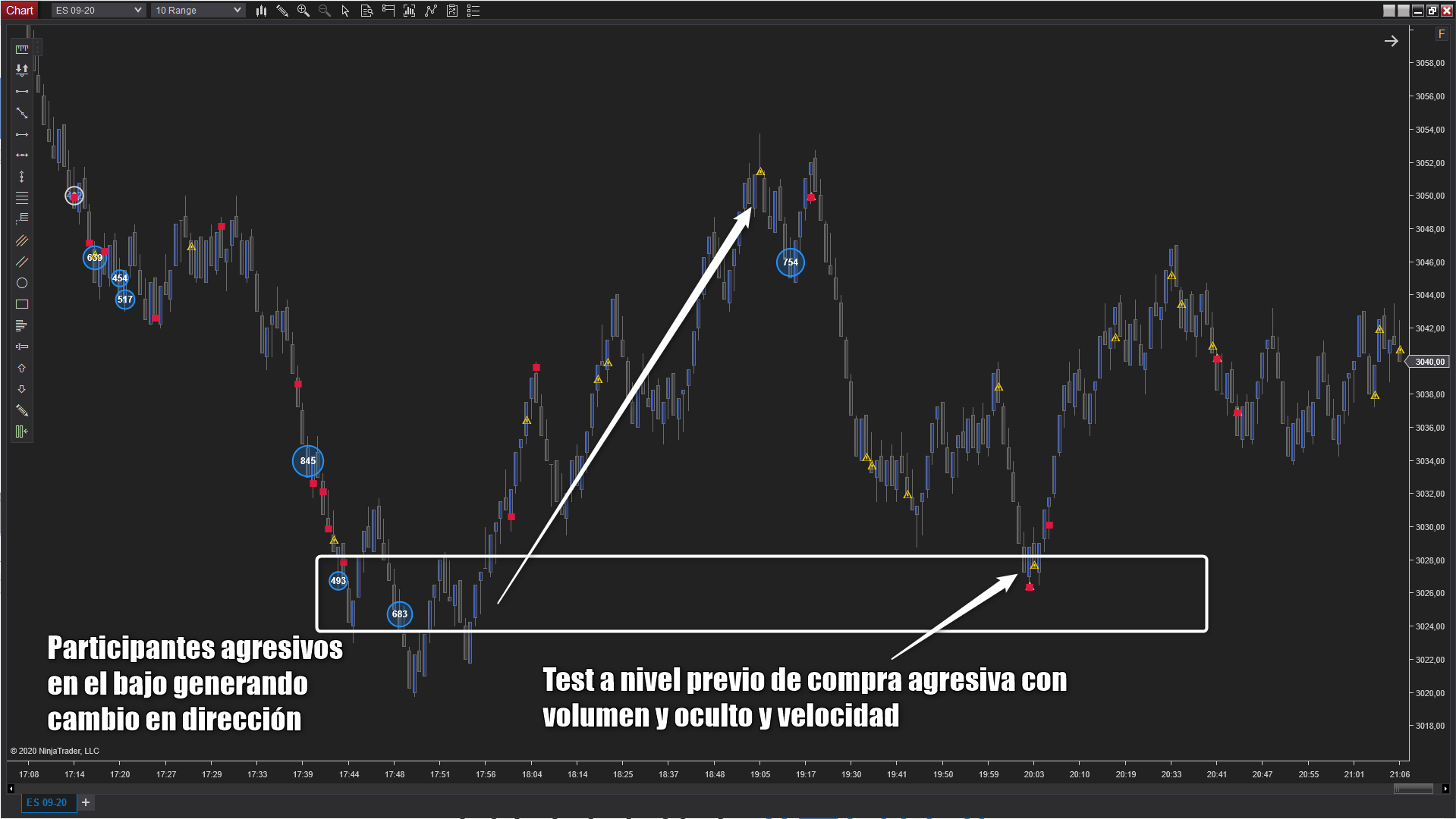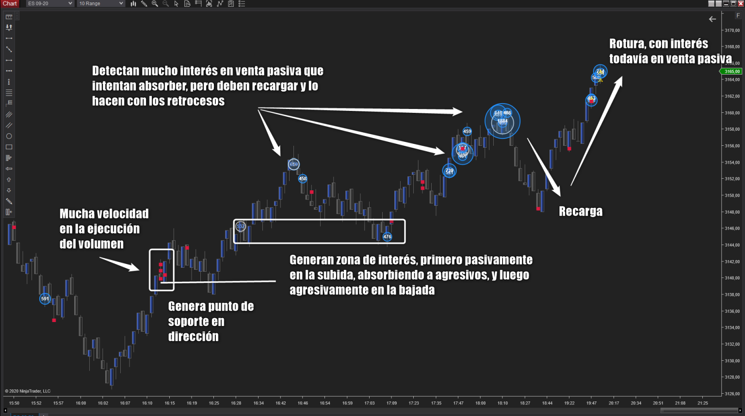 Es un indicador para NinjaTrader 8 que te ayuda a visualizar acciones que por su naturaleza se pueden atribuir a los grandes participantes en el Mercado. Por norma general, los grandes participantes usan tres variables en su operativa, volumen, tiempo y ocultación. Realmente no es sencillo obtener este tipo de información con solo visualizar un vlc, delta, volume profile e incluso el DOM. Gracias a este nuevo indicador podrás tener en tu gráfico zonas específicas donde existen órdenes ocultas, volumen agresivo y velocidad de ejecución.
